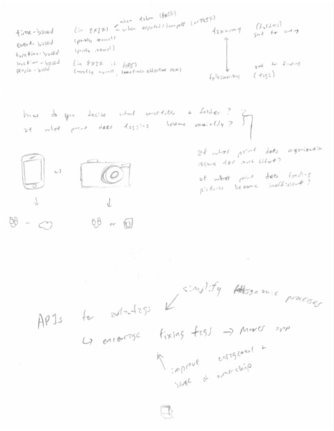 I did some observations of and interviews with several peers to get a sense for how they manage their photos, particularly on their phones. Some people relied on their computers, while others relied on the cloud the manage both. Either way, everyone organized their pictures in taxonomic and heirarchal folders, but everyone still navigated through these structures as though it were a learned, and not natural, process.